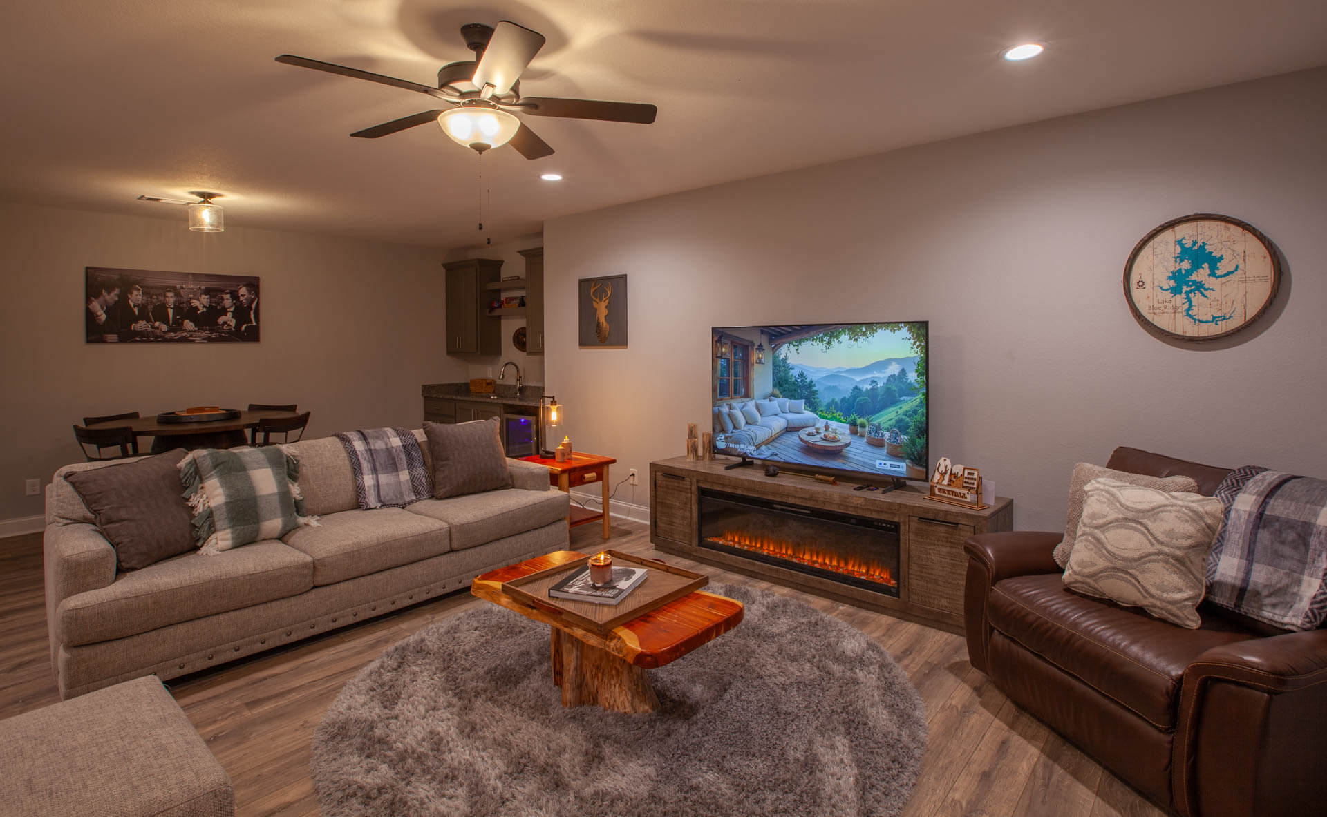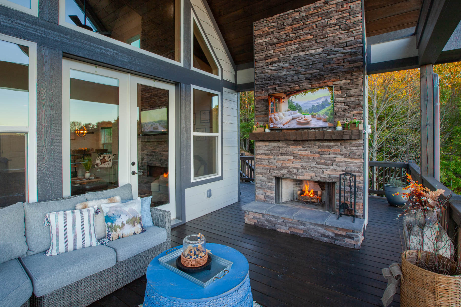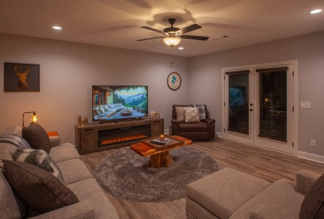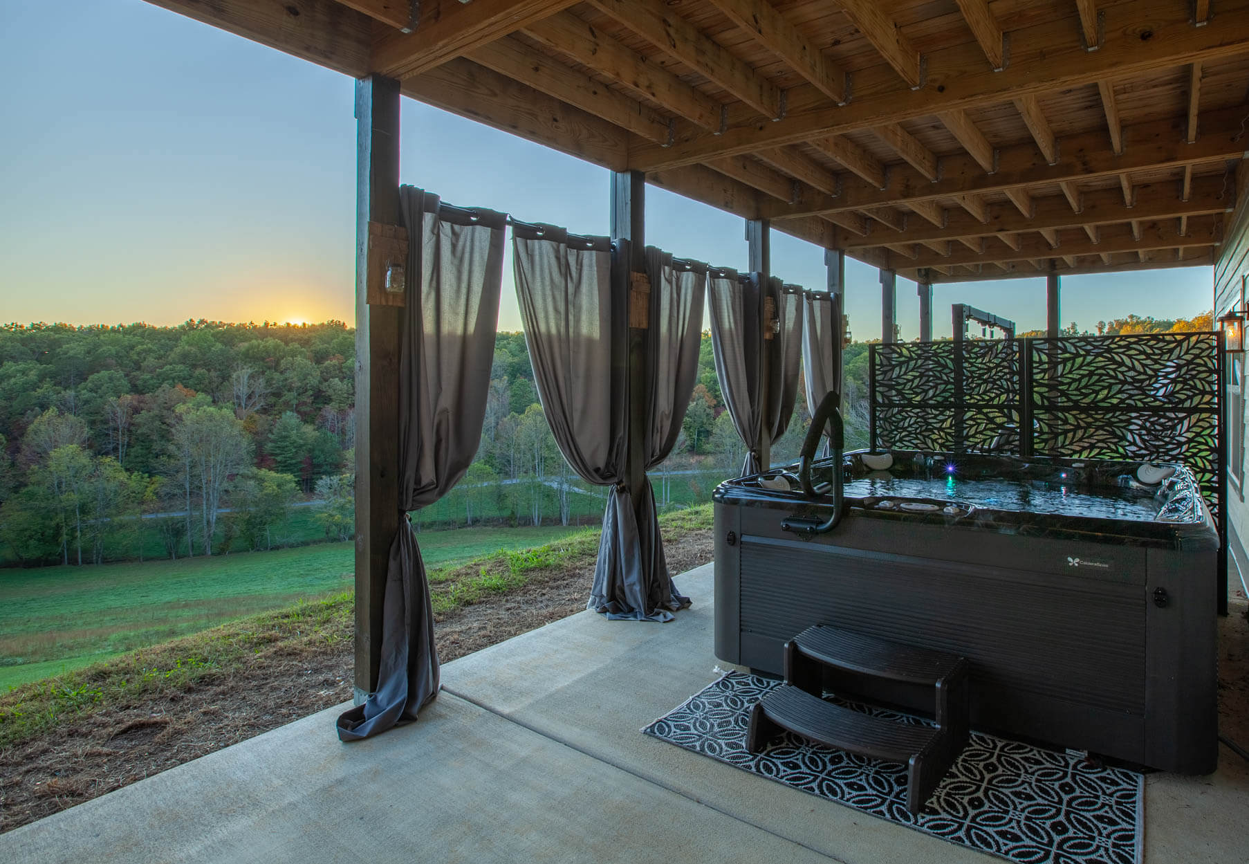 When the sun sets, the mood shifts from Appalachian adventures to Bond-worthy indulgence. Step downstairs to the terrace level to another stylish living area with a large SMART TV, electric fireplace, wet bar, and a game table. Outside, a hot tub, two swinging chairs, and a garden area with seating for two await you.