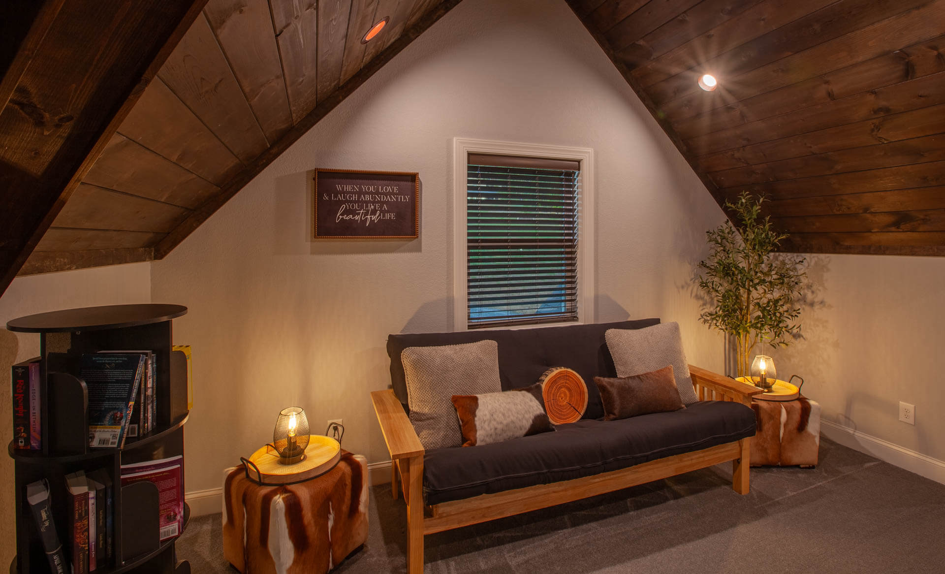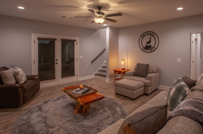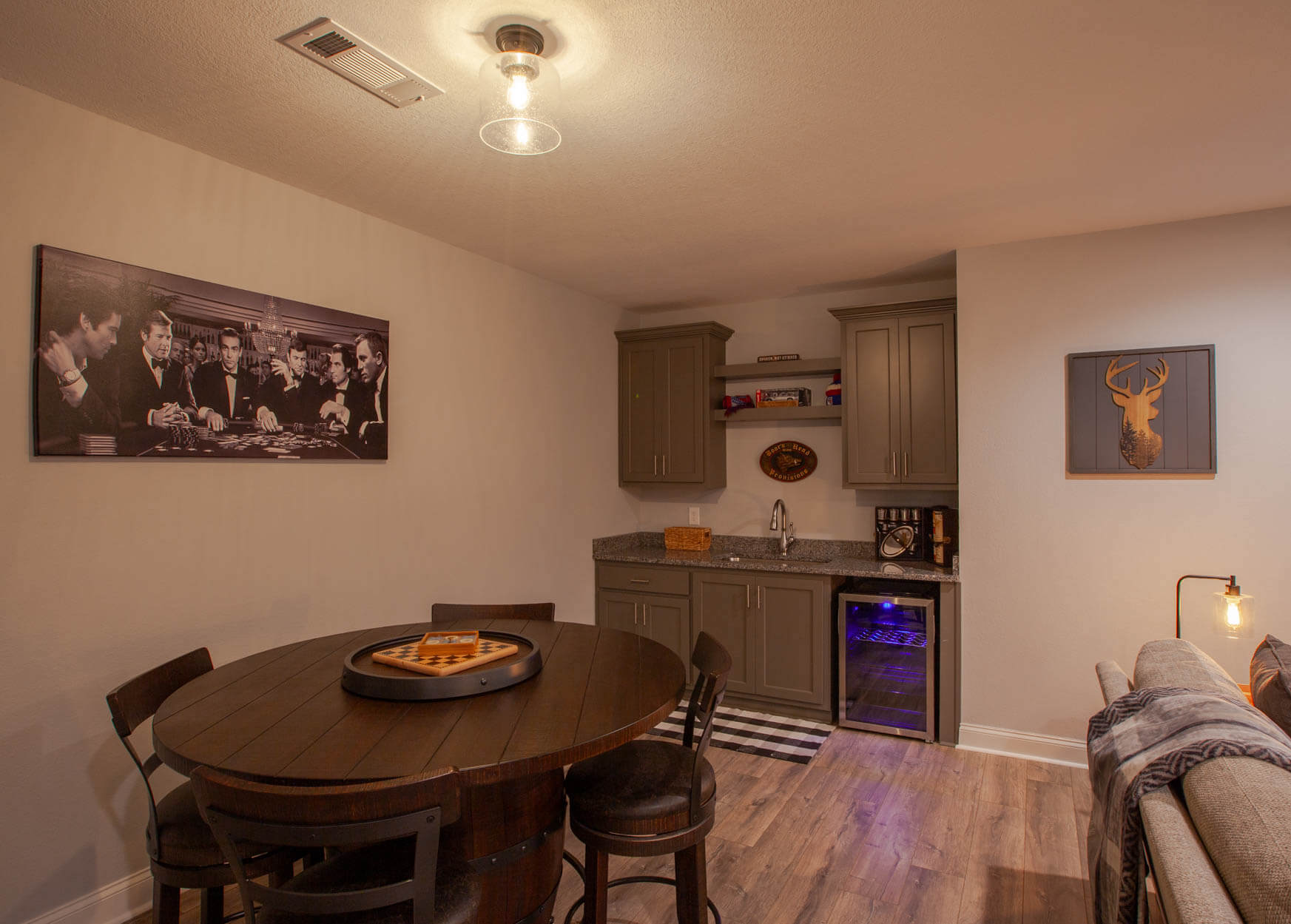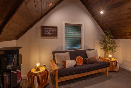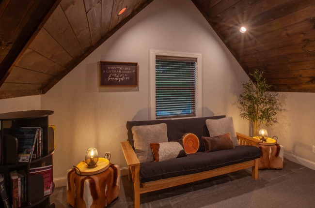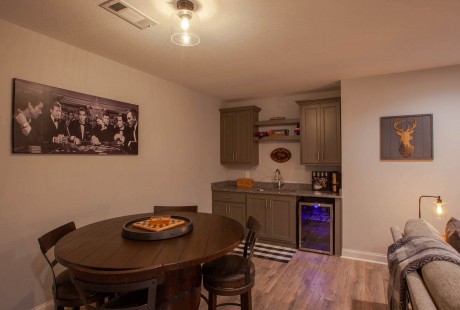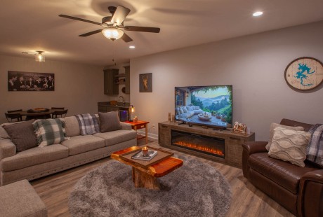 When the sun sets, the mood shifts from Appalachian adventures to Bond-worthy indulgence. Step downstairs to the terrace level to another stylish living area with a large SMART TV, electric fireplace, wet bar, and a game table. Outside, a hot tub, two swinging chairs, and a garden area with seating for two await you.