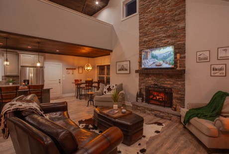 From the moment you step inside, Skyfall lives up to its name. A "cabin royale" of modern mountain luxury, the living room’s vaulted ceilings and expansive windows frame mountain panoramas, while a stacked-stone wood-burning fireplace anchors the space in warmth. With three floors of space and endless nooks for R&R, your stay here promises to be nothing but restful.